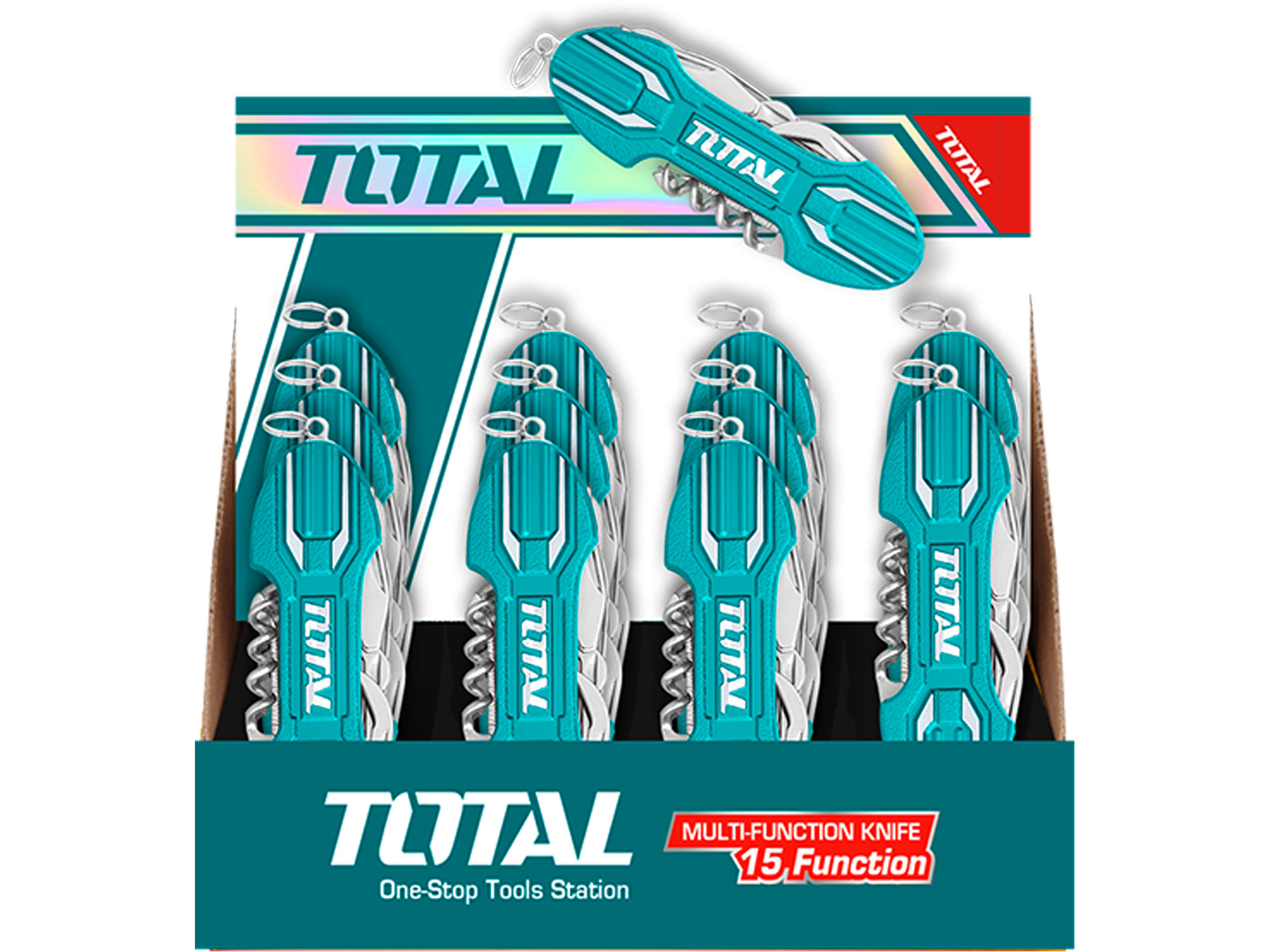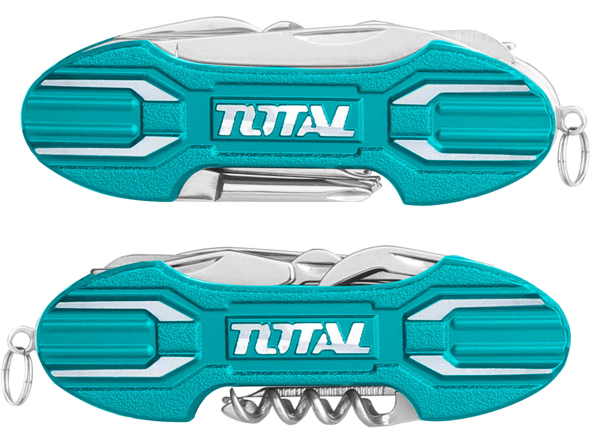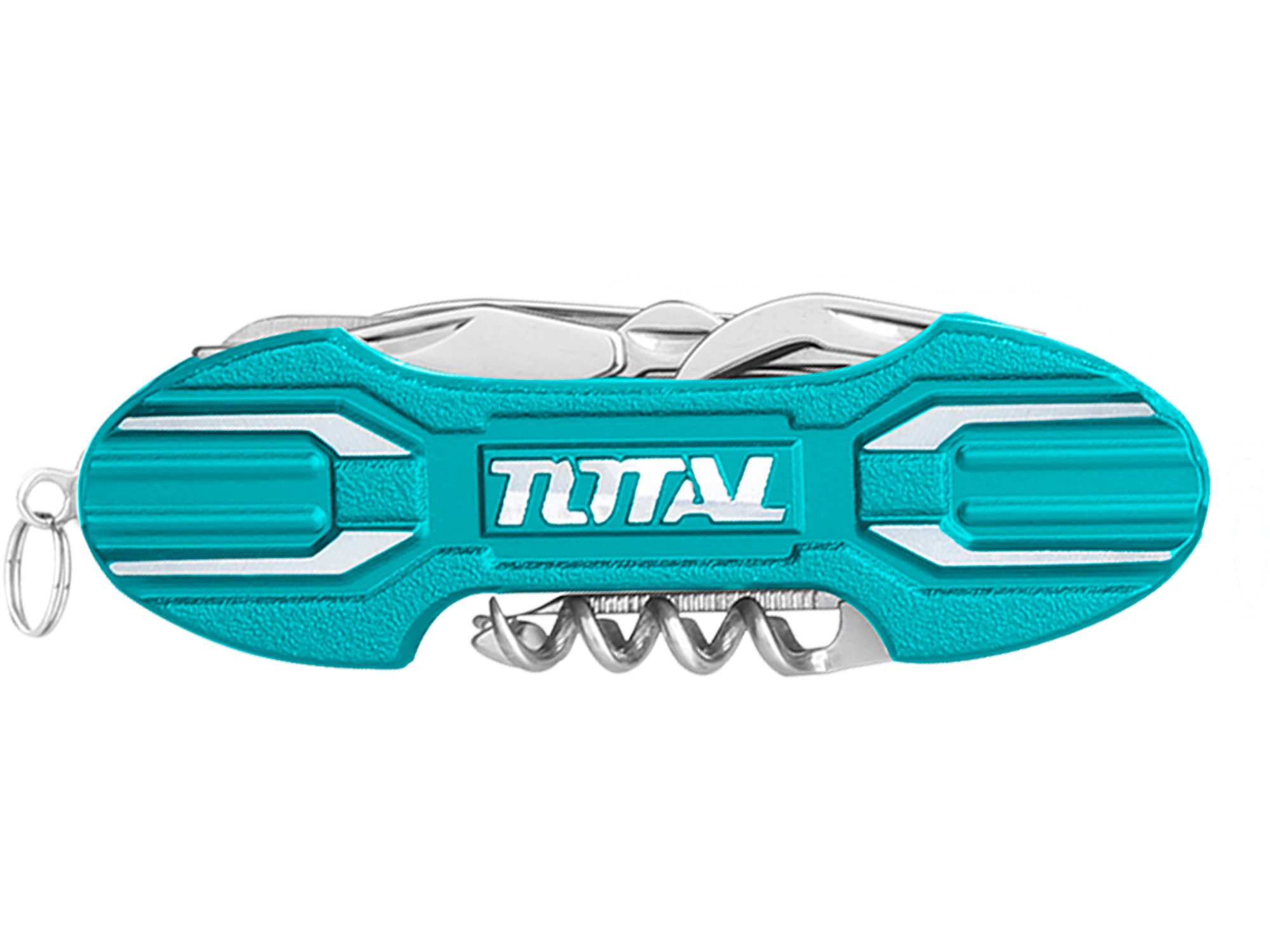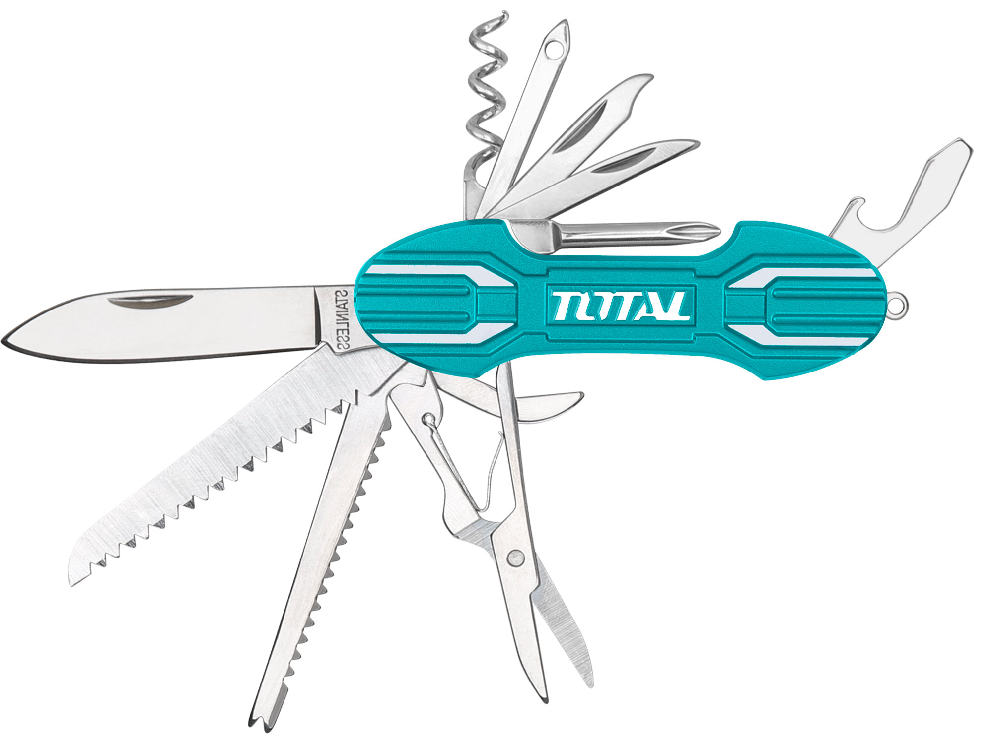 De schaar is gemaakt van hoogwaardig roestvrij staal, waardoor hij robuust en duurzaam is. De schaar heeft verschillende functies, waaronder een mes, schaar, kruiskopschroevendraaier, vijl, blikopener, flesopener, kurkentrekker, zaag, visschubber, haakverwijderaar, priem, nagelreiniger, nagelvijl, liniaal en sleutelhanger.