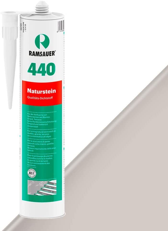Ramsauer Naturstein 440, 310 ml, fugengrau ist ein speziell entwickelter Dichtstoff für die Verfugung von Natursteinen wie Marmor, Granit, Terrazzo, usw. Im Gegensatz zu herkömmlichen Silikondichtstoffen tritt bei Kontakt mit diesen Baustoffen keine Randzonenverschmutzung auf. NATURSTEIN 440 enthält fungizide und bakterizide Wirkstoffe und ist gegen die handelsüblichen Reinigungs- und Desinfektionsmittel beständig. NATURSTEIN 440 ist geeignet für den Einsatz bei stark belasteten Fugen sowie im Unterwasserbereich.