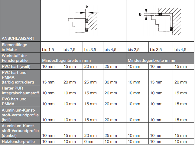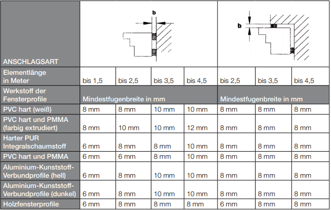 Om ervoor te zorgen dat er zo min mogelijk fouten worden gemaakt bij het dimensioneren van voorgecomprimeerde afdichtbanden , is de onderstaande tabel opgesteld door ift Rosenheim . Een vergelijking van tabel 1 met tabel 2 laat snel zien dat de voeg smaller kan worden gemaakt bij het gebruik van afdichtbanden dan bij het gebruik van pasteuze afdichtmiddelen. Dit is een duidelijk economisch voordeel van afdichtingstapes.