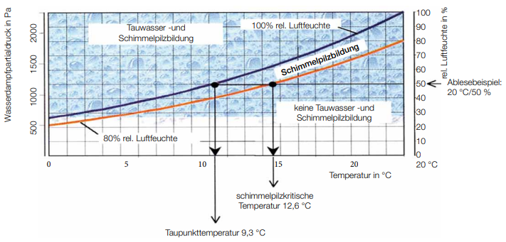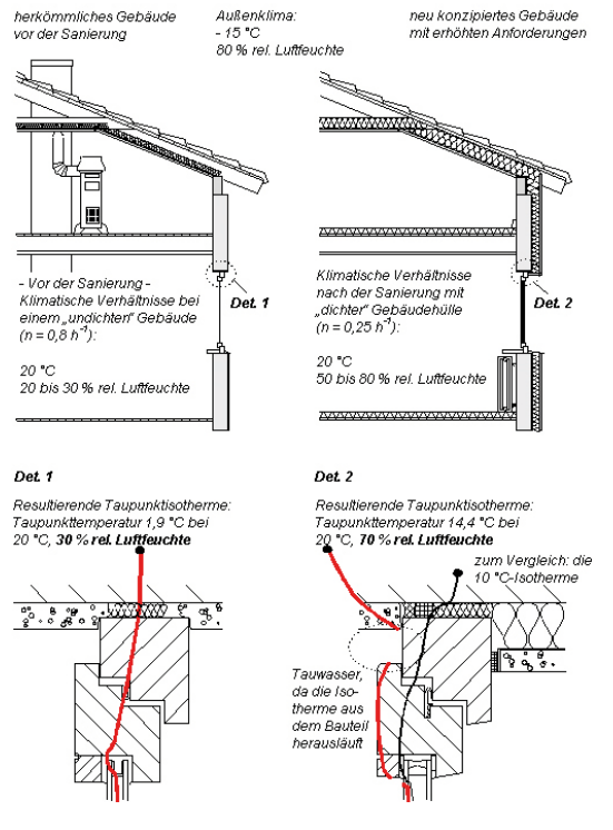 Als, zoals vermeld in hoofdstuk 6, de temperatuur van het onderdeel daalt en de omgevingslucht niet langer in staat is om het vocht te absorberen, zal er condensatie optreden. Een temperatuur van 12,6 ºC is in dit geval kritisch gebleken. Met behulp van speciale software worden de oppervlaktetemperaturen in een gebouwverbinding bepaald en verbonden tot een lijn, de zogenaamde isotherme curve.
